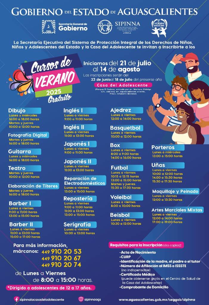 Para más información sobre los días y horarios de los cursos, comunicarse a los teléfonos 449 910 20 53, 449 910 20 67 y 449 910 20 74, así como a través de las redes sociales del Sipinna https://www.facebook.com/sipinnalacasadeladolescente o https://www.instagram.com/sipinnaags/.